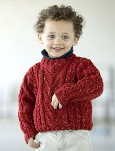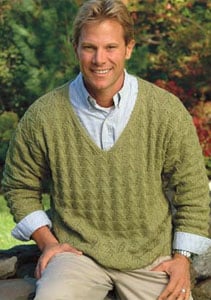 If you wanted to make the Alpaca Cable Turtleneck a little more breathable, you might consider Classic Elite Four Seasons (70% Cotton, 30% wool) as a substitute. The gauges match, and as a cotton blended with wool you’ll get the coolness of the cotton with the stability of the wool — a necessity with all those ribs and cables.If you’re like me, you’ve found that men tend to favor sweaters that aren’t as insulating. The Cable Rib V-neck on the left is made from Classic Silk (50% cotton, 30% silk, 20% nylon) and the Triangle Pattern V-neck is made out of Classic Elite Provence (100% mercerized Egyptian cotton).