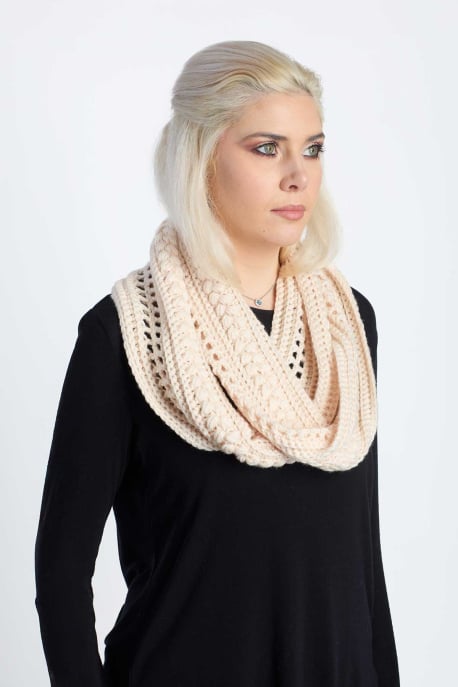The Mosswood Cowl is a cozy, textured layer with breathable mesh and plush puff stitches – perfect for transitional weather. Wear it as a snug single loop or a drapey an infinity. Inspired by mossy forest floors, it blends lightness and depth, is simple to make, and feels like a little a piece of nature around your shoulders.