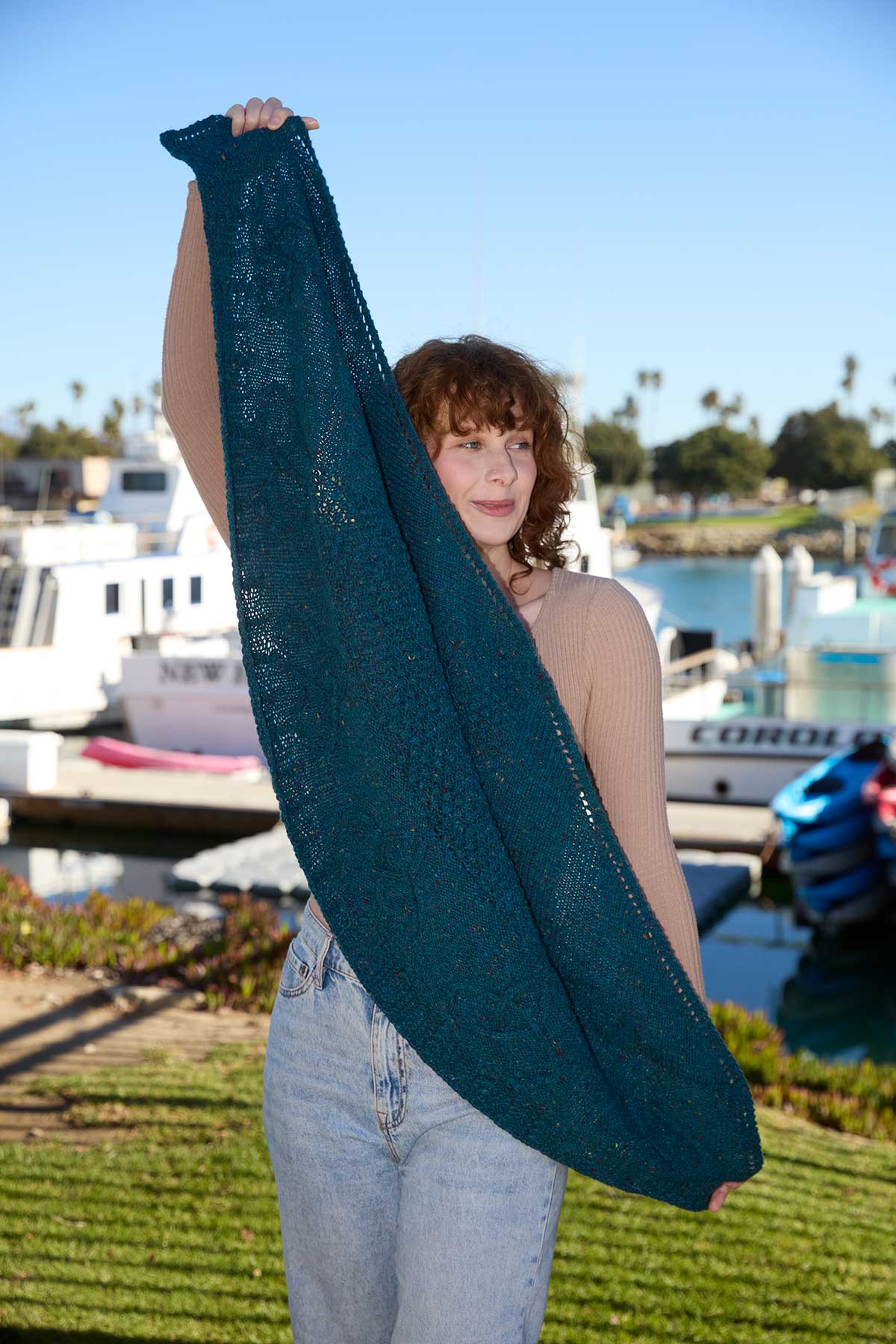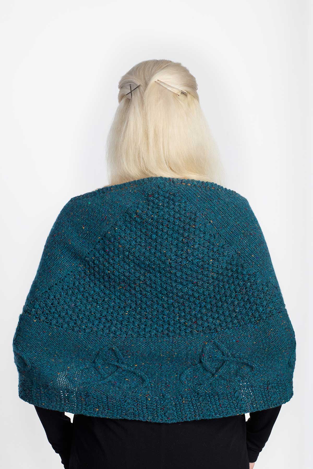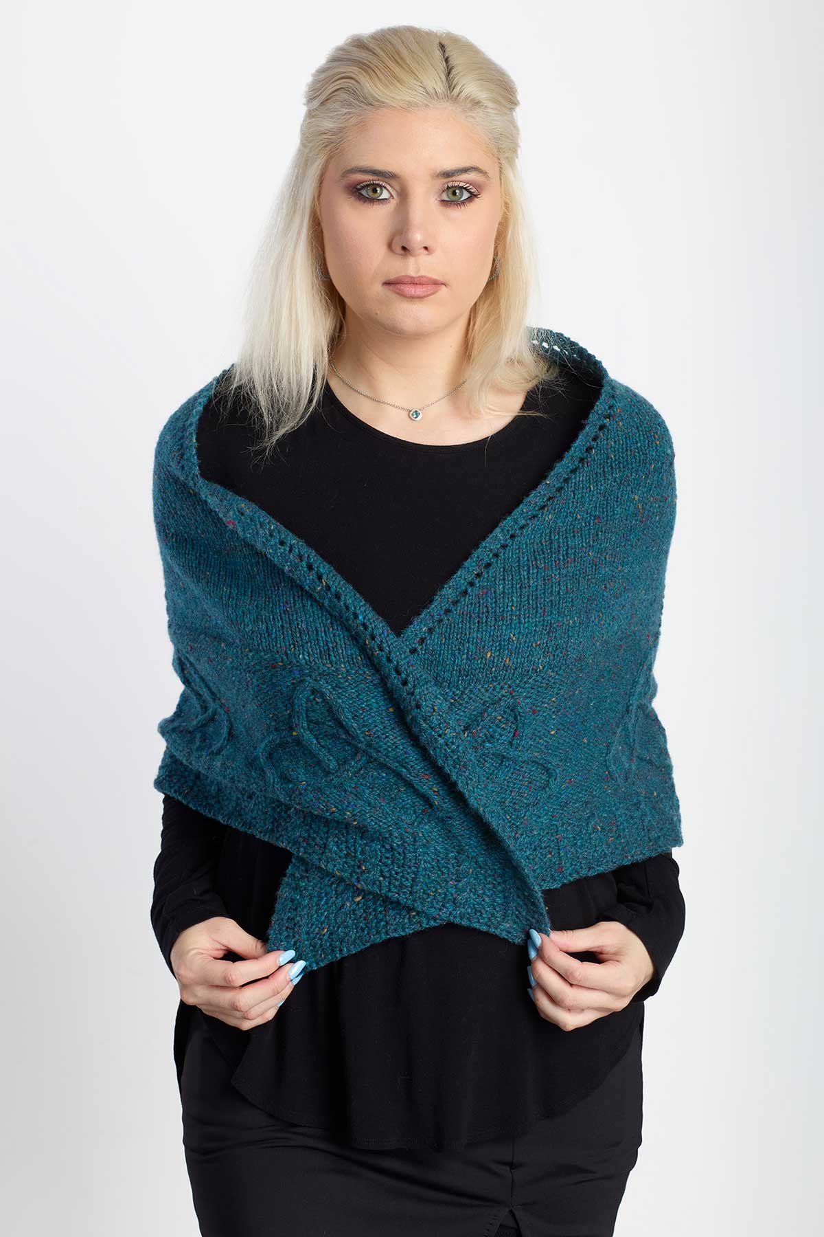 This top‑down, semi‑circular shawl has Celtic twining cables and textured stitches. Stockinette wings and a trinity‑stitch center flow into a border of Celtic motifs framed by Irish moss rib. Worked in worsted, it knits up quickly into a warm, cozy wrap for winter.