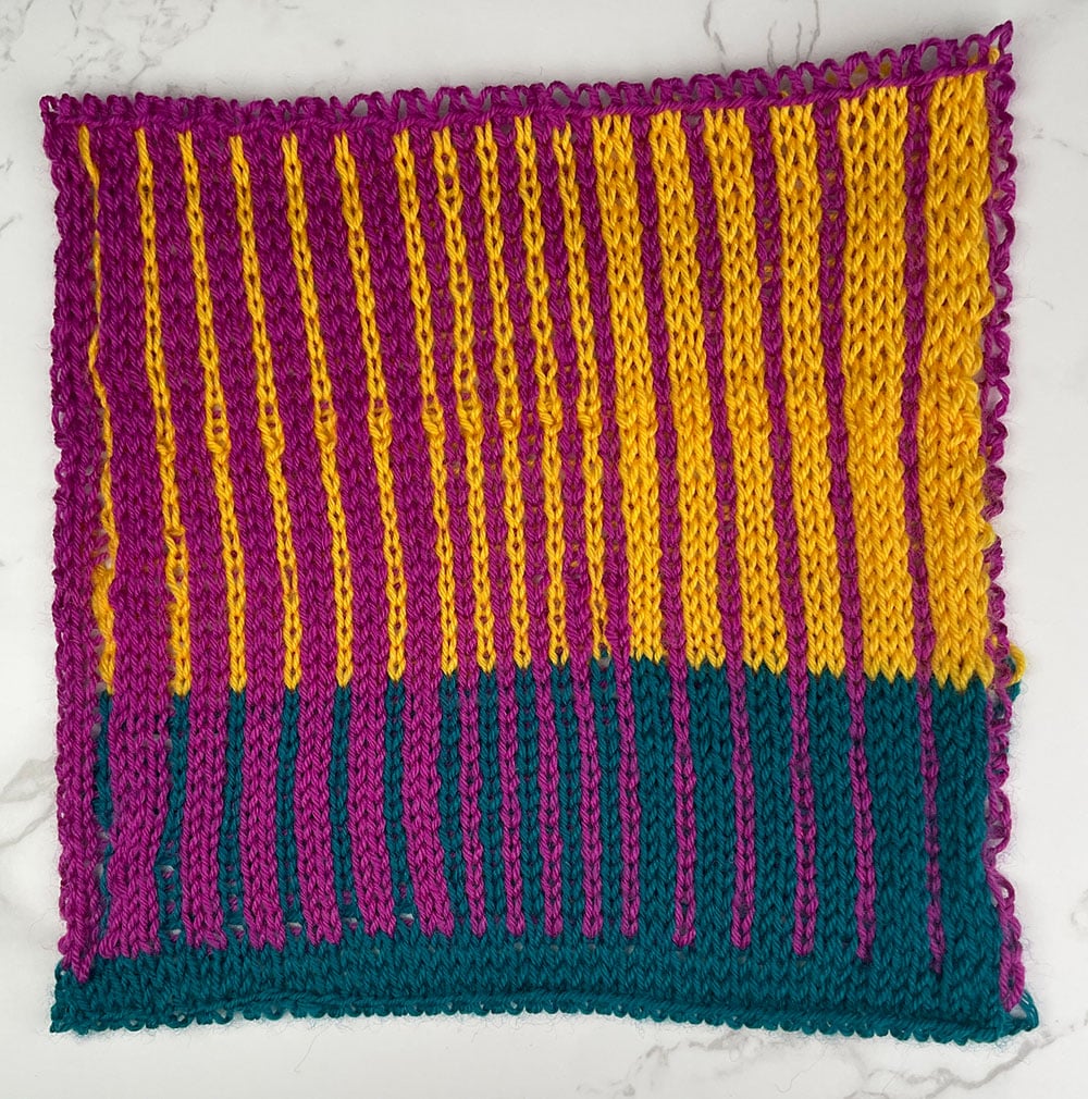 March’s square turns stripes on their side. Vertical stripes create a completely different energy than the horizontal stripes you’ve been knitting, and the jewel tones make every column of color pop. The technique is simpler than it looks, but the result is a square that feels bold and modern.