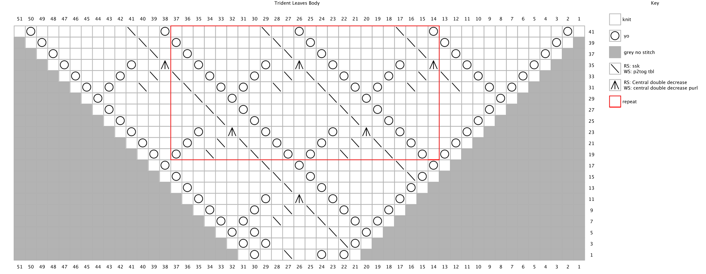 Inc Row 4: K3, sm, yo, k to next m, sm, *beg Cascading Leaves Chart on Row 1, work chart to m, sm, rep from * two more times, sm, k to next m, yo, sm, k3 – 8 sts inc’d, 47 sts.
