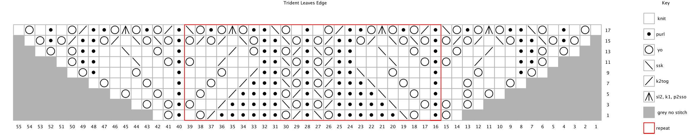 Next Row: K3, * work Double Leaves Chart on Row 3 to m, sm, rep from * four more times, k3.