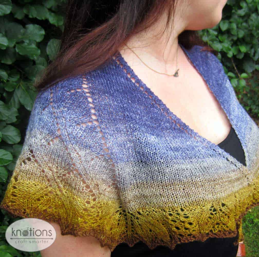 This pretty leaf-inspired shawl is knitted from the top-down, beginning with a cascading leaves pattern, and ending with a complimentary leaf border. The beautiful wool ombre-colored yarn is a lovely compliment to the organic flow of the lace patterns.