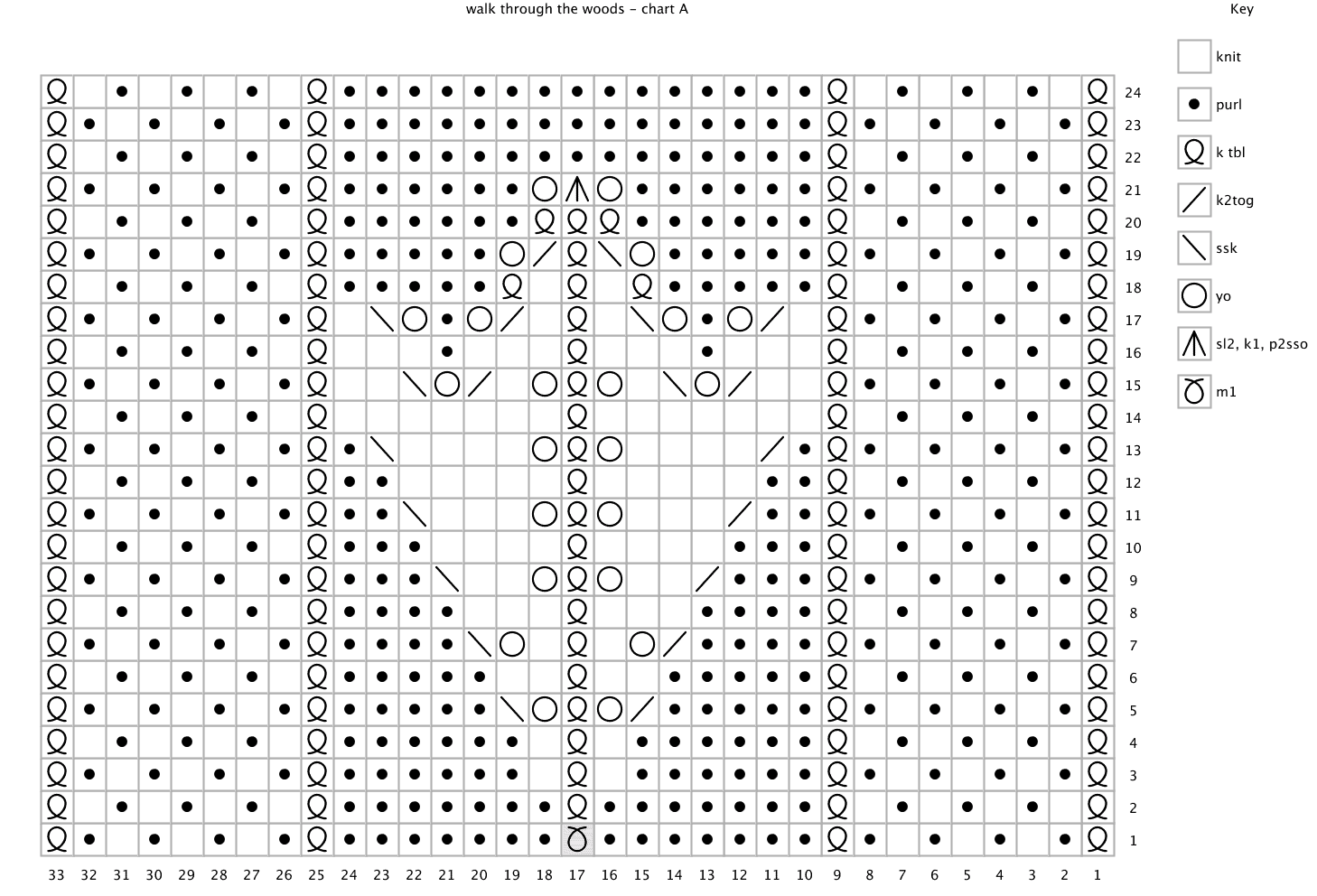 Rnd 2: Knit to first marker, slip marker, work Chart A across 33 sts, slip marker, knit to end of rnd.